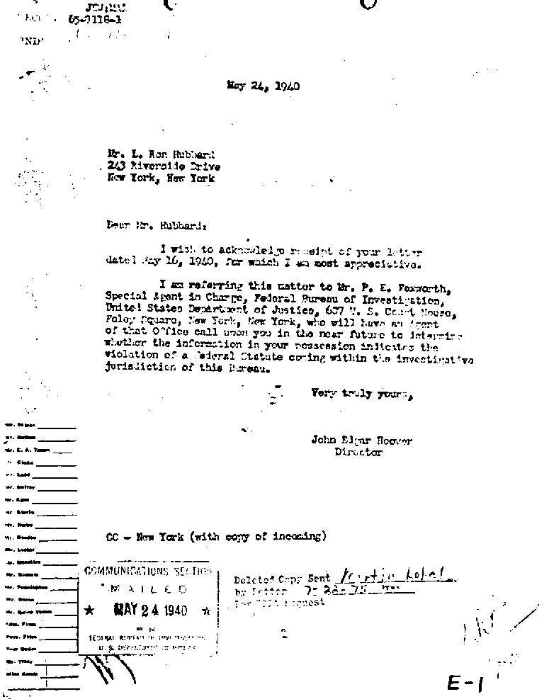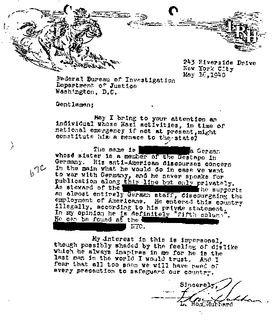 In 1940, L. Ron Hubbard was living a hand-to-mouth existence in New York City, writing penny-a-word pulp fiction stories. Whilst there, he apparently had an argument with a steward in the hotel at which he was staying. He promptly got revenge by denouncing to the FBI the unfortunate man, who was of German descent, as being "a menace to the state". This was, it seems, the first contact he had had with the FBI and began what became a long tradition for him of denouncing to the authorities those he disliked. It also emphasised his Germanophobia, a trait which he never lost (and which is still visible today in the Church of Scientology's campaign against the Federal Republic). Needless to say, the allegation was patently baseless and the FBI took no action.